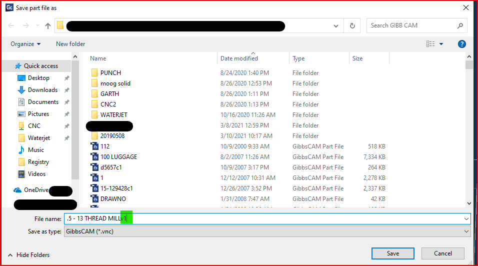 One Drive will not sync if the file is open by a program, in this case it is Gibbs Cam
